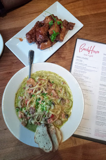 Very, very loud during 9pm Happy Hour. Ears hurt. Happy hour salad was very good! Husband had seafood Tacos, but was not hot, only warm. Good taste, but took 40 minutes to get food despite our waitress letting us know that food will be right out, three times. Generally get brunch from time to time, but wont be making Wednesday night happy hours. I will opt for something lower key and without the noise and lower anxiety level, like a favorite go-to, such as Market St. Grill. Will still definitely have intermittant weekend breakfast at BeachHouse, cant beat the view.