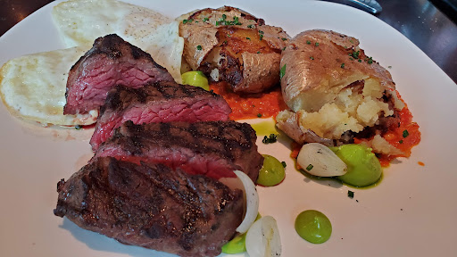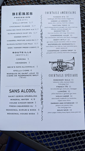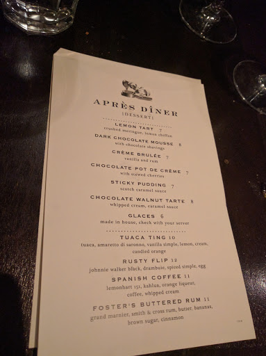 Wonderful food. Great service. Very unique drinks and ice cream. I had the Rosemary Mule and it was a great devaiton from a standard Moscow mule. The jumbo shrimp cocktail was impressive. While there were only four, each was massive and the homade cocktail sauce was thick and came with the necessary horesradish kick. My main course was LEntrecote. A perfectly cooked medium rare with a robust bordelaise sauce. Special mention for the roasted Yukon gold potatoes with a French fry finish. Think scrumptious roasted Yukon gold potatoes that are finished fried to crispy perfection. They were almost better than the steak. For dessert I had blueberry lemon thyme ice cream. It was a delightful finish. Creamy and rich without being overly sweet. My only complaint would be the portion to price ratio. However, I throughly enjoyed every bite.