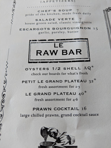 Dining at Le Grand Bistro is like dining at a good bistro in Paris. From the amazing view, excellent food and wine list, dinner here is Paris in the Northwest. I had the french onion soup which was a rich savory mix of onions, country bread and toasted Gruyere cheese. Delicious rendition of a French classic. We also had oysters with migonette, cocktail and fresh horseradish. Another tasty starter. For entrees we had rib eye steak, truffle mash potatoes, shallots, red wine sauce and a portion of frites. Steak cooked a perfect medium rare, great flavor and frites very tasty. We also had the fish (sea bass) special with gnocchi, spinach, wild mushrooms and a saffron beurre blanc. Super tasty. Service was friendly and relaxed. Wines are very reasonable and a large selection. You cant go wrong with this place.