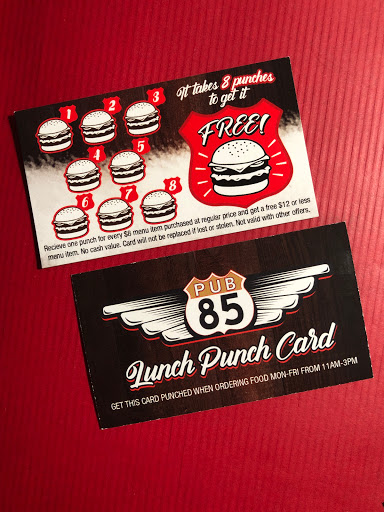 Pub 85 is awesome. Always have fun. I just had the $10.99 Thursday steak special. One of the best steaks ever. The baked potato was awesome. The burgers I have had here are always awesome as well. Check them out. Lots of video screens to watch the games. The menus and offerings are on some of the screens. I love it.