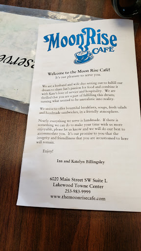 This is my favorite little cafe in the Lakewood/Tacoma area. Its family-owned and always busy, centrally located within Lakewood Towne Center and right across the parking lot from Starbucks. The food is always delicious, the portions generous, the staff friendly, and the prices EXCELLENT. They serve fair-trade organic coffee with free refills, also, and have great milkshakes. Say hi to Kris (the cook and owner, usually in the kitchen in the back, but often comes out), or her daughter, Sam, whos a waitress and will get to know you if you come a couple of times. The atmosphere here is quaint and casual, with local artists featured on the walls and poems framed over by the bathrooms. Its really small but extremely friendly and completely worth visiting. Try the Monte Cristo sandwich with a salad (their greens are always very fresh and clean), or toast with their homemade raspberry jam, which they also sell in jars. Their hashbrowns are hand-cut and the best Ive ever had. Also choose from an awesome selection of burgers and sandwiches (I love the club on rye!), omelettes, pancakes, french toast, steel-cut oatmeal...They will accomodate whatever dietary needs you have and its really easy to make healthy choices here. Go visit Moonrise and keep them up and running...they deserve it and youll be glad to keep a place like this in the community!