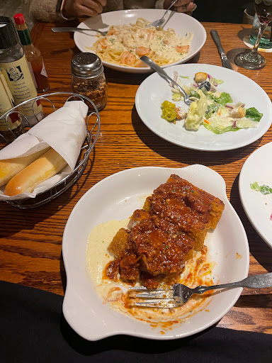 Cane here for my burthday dinner and Im glad I did! I am always rooting for Olive Garden when it comes to picking out a restaurant to go to, which is not very often! How can you go wrong with pasta SMOTHERED in cheese?? Comfort food at its finest! 1. Going out to dinner with an 18 month old toddler is always an eventful experience, especially when hes getting tired and hungrier by the minute. Yes, the food took Libbey than we wouldve liked, but the tables were full and the wait list never stopped getting longer. It was a busy night for all the staff so I cant blame them. 2. Our server was quick to check on us while we waited for our meals, mak8ng sure to keep salad and breadsticks on the table. He was effecient, but not overly effecient by maintaining good time management. 3. Server was also very friendly & always smiling, despite the mess made by our son. Seemed to really enjoy his job! Overall, great experience dining here, as always!!