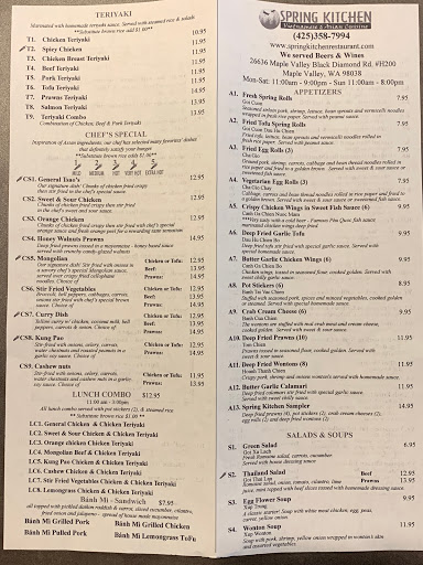 The food at Spring Kitchen is so fresh and delicious. I grew up eating homemade food from scratch and this food tastes that fresh to me. Its my favorite takeout in Maple Valley. A word of advice: it seems like they dont have a ton of employees for when you dine in so I experienced quite a wait. But I still give them five stars for their delicious food! Its worth the wait in my book!