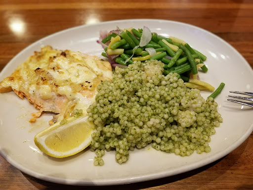 The service was good. The food was horrid. It used to be good until they changed their menu and cheapened it up. They used to have a good Asian salad. The last one I ordered arrived at my table with a blob of white boiled chicken on top of lettuce with some dressing. It looked disgusting. It didnt taste very good, and I couldnt bring myself to even try the chicken. I can stay home and make better food......Oh and one more thing, they were short pouring the drinks. The Vodka Tonic I ordered was Tonic with a touch of Vodka. I sent it back. Got the same thing back. Im not going there again. McDonalds has a better salad.