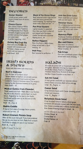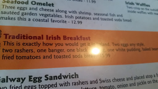 I came here with my family for a birthday lunch. My parents had heard a lot about the place and their excitement was enough to convince me to give a try. I should have read the reviews first! When we got there, it was 11:51. We remember because we had discussed having beer before noon and had determined by the time we were settled and had looked everything over it would be after 12pm and ok for a beer. We were informed when we sat down that there was only one waiter working so there might be "a slight delay" since there was a scheduling issue and more waiters wouldnt be in at 1pm. There werent many others in the place so we figured it wouldnt be that big of a deal. We placed our order around 12:15 when the waiter/manager finally stopped by to take it. The waiter/manager stopped at our table once before the other wait staff arrived at 1pm to drop off our drinks 10 minutes after we ordered them. We waited. And waited. And at 1:15 the appetizers we ordered finally showed up. My husband had gotten onion rings - they arrived cold, limp, and extremely greasy. They looked like they had been grilled, not deep fried. My mom ordered a potato soup - and halfway through she found a long black hair (she has short red hair). I ordered the healthy fish and "salad" - which turned out to be shredded cole slaw and a huge handful of cheese. Fortunately my dad ordered the Irish breakfast and was happy. We had expected delays, but we watched others who had arrived and ordered after we had get their drinks and food refilled. It was a terrible experience, and deserves 0/5, but I will give 1 star for my dads enjoyable Irish breakfast.