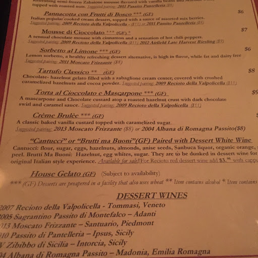 What a wonderful experince!!! The service was informed and friendly. They brought out extra polenta when we ran out and gave us extra mozzarella in our leftover containers to enjoy tomorrow! Also, their gluten free menu was the largest and best Ive ever seen, they make most of the pasta and food there and really respect that people with Celiac are concerned about cross contamination. Most of all - I have never had a dessert as good as their Tartufo Classico.