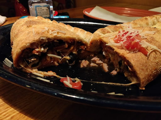 The garlic chicken calzone is huge and taste pretty good. The portions here are very big for the cost, if youre looking for somewhere to fill you up, this is the place to go. The service was good. I had plenty of water and the food didnt take too long to come out. The only thing lacking was the decor/atmosphere. A bit of an awkward setup with the townies people watching everyone.