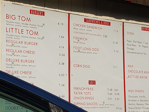 Ive had lunch here several times and have always had a great experience. There beef, chicken & fish burgers are all great. They make great fries & tator tots and I find them reasonably priced....and they dont skimp on those side portions. A large order of tator tots is enough for 3 people! I once ordered clam chowder and the manager was nice enough to tell me the batch had been burned so she was hoping to talk me out of it. She then offered me a free shake instead. Rarely has a restaurant told me that what I ordered was not up to their standards and rarely have I been offered a complimentary item in its place. I was quite impressed and very happy I didnt spend money on something burned. The employees are ALL friendly!!!!! Thumbs up Big Tom!