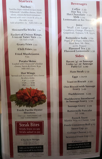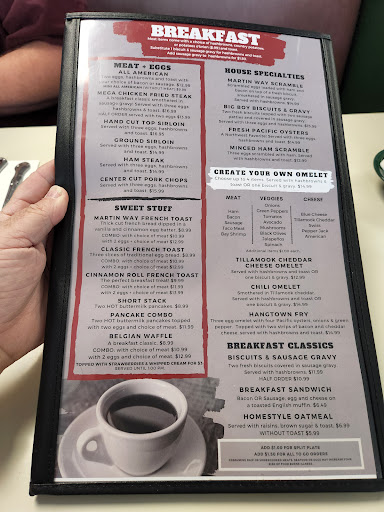 Seat yourself. About 12 Breakfast items. Good portions: All American Breakfast::2 eggs, 2 slices toast, 4 sausage links, two fist size amount of hash browns for $8.99 I ate at 9am on a Tuesday and had little wait time for food and serves with the place 3/4 full. Clientele was 50+ Waitress know select clients by name. The Martin Way Diner worth trying again and suggest to others .