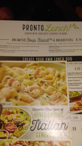 I love Olive Garden! In my family we have a tradition that when it is a persons birthday, he or she gets to choose a restaurant to go to for dinner on their birthday, and everyone else must go without complaining, and I always choose Olive Garden! The food is so good! I always order the cavatappi Alfredo with chicken, salad, and breadsticks, and its delicious every time! By far one of my favorite restaurants! (If Starbucks counts as a restaurant) Everyone there is so nice and there isnt usually a very long wait. The only downside is that I live 30 minutes from here! But its totally worth the drive, plus traffic! Highly recommend! I feel like a V.I.P. when Im there!