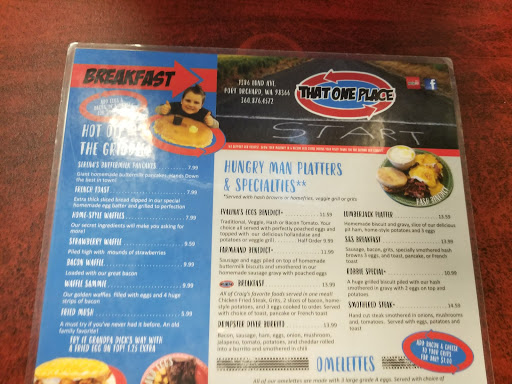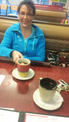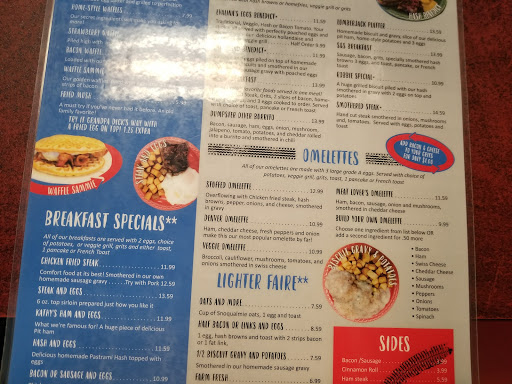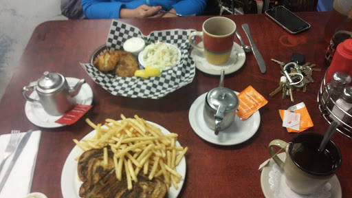 The good: their portions are filling, the food is pretty good, and the servers are welcoming and attentive. The overall impression I left with was positive, but some things could use work: They dont seem overly interested in maintaining a common theme. Several people said it had a Jeep or old car theme and they do indeed have that, but its cluttered with several other themes, too. Maybe one theme per wall? The menu is a deluge of single spaced typing and I dont recall any pictures...Its a hard read and several items served arent on it such as teas and desserts. The dining area could use some upkeep.