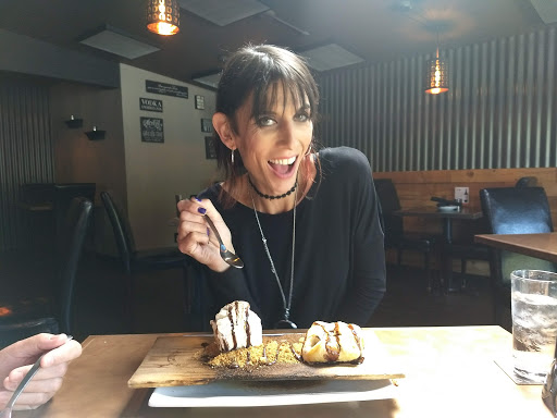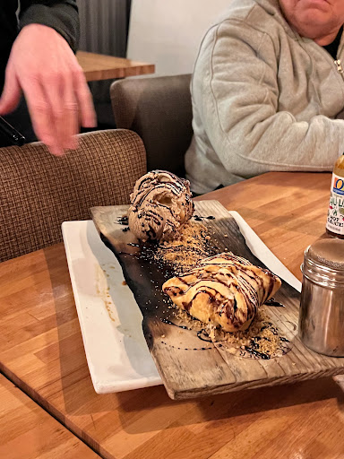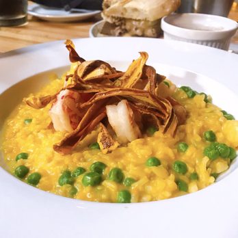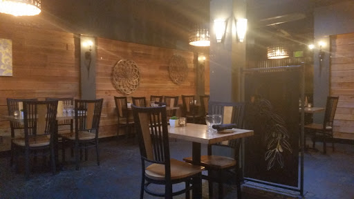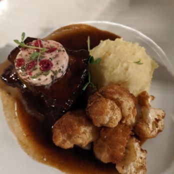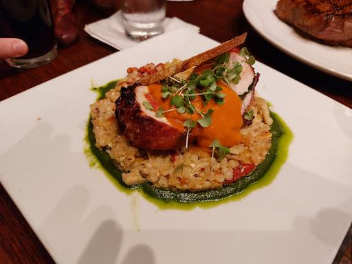 Pleasant space with an enthusiastic server and well conceived but unevenly executed food. The interior is simply and pleasantly decorated but dark, with tan stucco walls, white trim and pillars, exposed beams and ductwork and a brown faux stone floor. Candles on the table and lights behind large inverted domes of brownish glass suspended six feet above the tables barely give enough light to read the menu. There is dark corrugated soundcatching tile of some sort on the walls and ceiling which damps the noise, making the space lovely for conversation around the table. The waitress was pleasant, very young and not given to much description of the food beyond "its very good", although she did ask the kitchen staff when I had questions she could not answer. She got to me pretty quickly, but it was about 15 minutes between when I arrived and when the first food appeared on the table. Bread was very good -- chewy, crusty, slightly and pleasantly sour, and warm; it was served with balsamic vinegar, oil and mashed garlic. I had crabcakes for an appetizer, which was a mistake. Anyone who has spent much time within 10 miles of the Chesapeake tends to be fussy about crabcakes, I suppose, and I am no exception. These appeared to be made with canned crab of modest quality, shredded finely, overly salty, with no large chunks and a mushy interior texture, though they were browned nicely on the outside. They were served with a pleasant pepper aioli and nicely garnished with brocolli sprouts. For dinner I had pork cheek with a wild mushroom risotto, which could have been excellent. The pork and mushroom flavors complemented each other extremely well, and I like but hate to make risotto, so this was a welcome companion. Like the crabcakes, the pork was heavily salted and perhaps worse, the salting appeared to be uneven, so there were intense bites of salt which no other flavor penetrated. The least salty areas, which the pork and mushroom flavors dominated, were very tasty. There was no vegetable side dish with the entree. I had the wine recommended by the menu to accompany this dish, which was an uninspired Washington pinot noir. For dessert I had three scoops of ice cream, not made by the restaurant but under contract to it. The pear ice cream was really good, the habanero chocolate ice cream was an interesting idea but with less intense flavors than you would expect, and the salt caramel was not much of either. Theyre making a good effort here, the chef has good ideas and Id like to see this place improve, but right now for $55 I found this the least impressive meal Ive had in my trip to Puyallup.