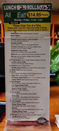 Ok, so I have been wanting Good Sushi for a while and wanted an all you can eat place. Sushi Paradise did more then just meet my standards they surpassed them by leaps and bounds. When we got there I wasnt sure what to expect because I read the reviews on here and everyone seemed impressed but when we got there the place was empty other then a women and the man behind the sushi bar. We were greeted by the women who was very friendly even teasing My husband and I that they had been there five years and what took us so long to come for a visit, she quickly got us to are seats at the sushi bar (very pretty) and took are drink orders (Ice Tea) and even took the time to explain the Menu a little for the all you can eat sushi rolls. The chef making are sushi rolls did an amazing job he was friendly, polite and also asked if we had any questions, He was very fast with are sushi orders. Each order was just as good if not better then that last after every roll we were impressed even more and when we told him it was are 3 year wedding anniversary he asked if he could make us something special and we agreed he made the most amazing sushi rolls with a lightly torched salmon on top and also decorated the plate with Orange slices, whip cream and a cherry on top and lit the orange skin on fire on top of a wine glass in the center to blow out for good luck. The sushi he made us that wasnt on the Menu was to die for and one of the things I liked best of all was that even after we were super full he still wanted to make us more sushi we walked out of there with are tummys so full I felt like we could have exploded. We will be going back here from now on when we want Sushi for dinner or Lunch. I truly cannot express how impressed I was with there Sushi rolls and serves.
