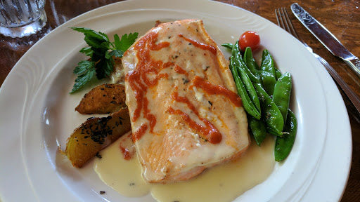 I have to caveat this review and break it into sections because some elements were VERY good. Atmosphere - Four and a half stars, wonderful timber building with woodsy decor, fireplaces and timber tables. Would have liked soft music instead of birds chirping but all in all a beautiful place. Food - Four stars. Aside from the salmon being a bit overcooked and the sparse vegetables (we love our veggies) the food was very good and presented nicely. While I felt the food was a bit overpriced it was good. Service - One star. I have never been to a restaurant of this caliber and seen such a disorganized staff. It seemed they were, using an old military term, "milling about sharply." Which means look busy and dont worry about getting anything done. I made the comment that the owners possibly bought the business and hired all their friends to help. They were literally at our table four times all night: 1) Drink orders 2) Delivered drinks and took order (Long pause) 3) delivered food (another long pause) 4) brought the check (after we asked). So while the atmosphere and food were very good the service was equally bad, averaging those scores end up with three.