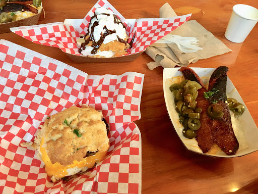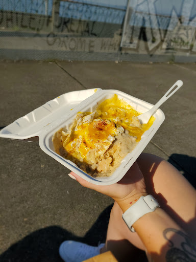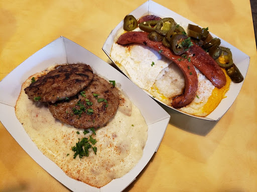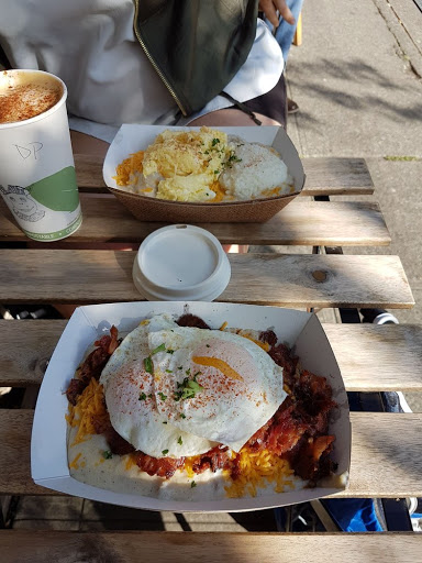 Good food, fun atmosphere, and super nice employees. There was quite a wait but it was worth it. Listened to music and mingled with other patrons while we waited. The espresso wasnt very good, but they gave me a free mocha so that was a bonus! The food could have been a tad hotter. But they were super busy so that could have explained it. It was still warm though. The homemade biscuits and gravy were killer. Very tasty. Would definitely return, though maybe to one of their other locations that have seating and a wider menu.