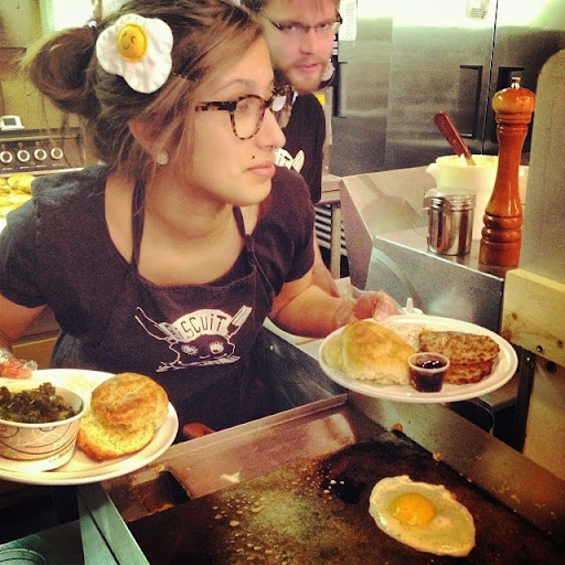 This place is pretty small, we walked pass without noticing it the first time. The breakfast biscuits are so puffy and delicious we have gone back couple of time. Be warned, the place is small you have to wait outside after you order and listen for your name when your food is ready, than you hope someone leave and you can get a table to eat. I agreed with one of the other poster, the Denver biscuit company (AKA Atomic Cowboy) is better.