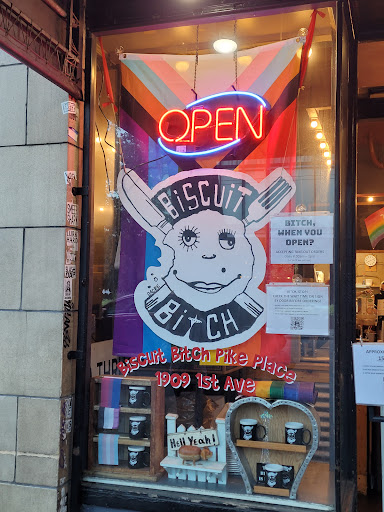 Sassy name aside, this place was okay. Since its downtown, parking is a nightmare, and it takes a while to get your order. The biscuits were good but they werent the best we had in Seattle, especially considering the wait and lack of seating -- try Dish or Serious Biscuits & Pie first. On a brighter note, Ive always enjoyed local restaurant/bar goods (stickers, t-shirts, mugs) as souvenirs, and they were offering a free sticker for Facebook check-ins, so there was that!