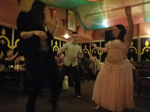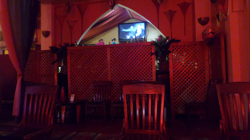 We went on a Friday night, which includes a belly dancer during a few hours of the dinner rush. The strengths of this restaurant were the atmosphere/decor, pleasant service, and amount of food provided. The rooms are nicely decorated with comfortable cushion backed pillowbooths, ottoman seating cushions, metal engraved round tables, and pleasant lighting. For a couple, sitting in the pillowed booths is very nice, but the ottoman seating might wear on ones back. Very nice ethnic music was played at reasonable levels and the dancer was entertaining, accommodating children wanting to dance near her, and even found some adults to teach a little bit of dancing. For a Muslim family, they might want to be seated in a place where there is no dancer due to the dancers dress. The service was excellent, dirty plates removed, glasses filled without asking. Any requests were quickly responded to. Now for the food. We were presented with a menu for a 5 course meal, $25/ person. Eating at a good restaurant will generally cost $50 once youve ordered all the necessities like bread, rice, tea, and dessert. Probably the only difference is here you dont get to choose, with the exception of the main course. However, there was a wide variety of main courses to choose from. I found that not having to choose all the additional things was in a way relaxing and exciting. We were truly being served a meal. Where the true disappointment lied was the taste of the food. Nearly all of the food was bland. My previous experience with Moroccan food included a variety of spicy foods and sauces with traditional flat bread. This food was quite different. I did ask the waitress if the food was authentic Moroccan. I was told their chef is Moroccan and the food cooked in an authentic style as you might expect in Morocco. The 5 course meal: 1) A bean and lentil soup was served. This was by far the tastiest part of the meal. It was a little extra peppery, but it had a nice flavor. 2) A "salad" which consisted of what looked like minced carrots and chopped tomatoes and maybe avocado. It kind of tasted like salsa, and was served with a baked white bread. It was good. 3) A round pastry consisting of philo-dough and stuffed with minced chicken and some kind of nut. The outside of the pastry was strangely topped with powdered sugar and cinnamon. This dish was surprisingly dry and bland. I think it would would have been better with some type of vegetable inside too and some kind of spice or flavor inside. 4) The main course. We ordered lamb w/cauliflower, and a cornish hen w/onions. The major problem here is that while the meat was tenderly cooked, it was also bland. For someone who eats meat so they can savor the taste of the meat itself, you may truly enjoy this experience, but we prefer the savory juxtaposition of meat & spice. The main course was rather disappointing because of the lack of flavor. The waitress said they only use spice when specially requested. A complaint because the waiter did not let us know that was an option. IF you want spice, ask for it up front. Also, I think all dishes should have included rice or couscous. We got a dish with meat, meat juice, and a few vegetables in the juice. 5) Baked pears with chocolate sauce drizzle and a cup of green tea with mint, jasmine, & honey. This was very tasty, but we would have liked the portion to be larger and offered a refill of the cup of tea, particularly after the disappointing main course. Overall, this restaurant has the potential to be amazing, and despite the disappointments, my wife and I had an enjoyable time among the other patrons and atmosphere. It is difficult to give this restaurant an above average rating as a result of the lackluster performance on the main course. If they improve that, offer some spicy options, add some rice/couscous, this rating could easily jump to 4 to 5 stars without a doubt. I imagine that my wife and I will consider revisiting in the future and asking for a spicy meal next time and hope that we get that type of experience!