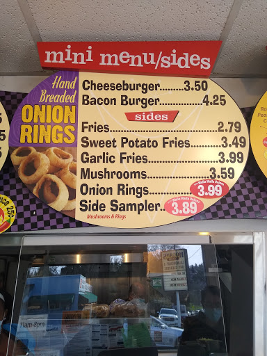 For a decent burger at an affordable price this place is great. The staff is friendly and quick. The interior offers bar seating for maybe 6 people. There is also at least one table outside by the 3 parking spots in the back. I believe they also use Walla Walla sweets (onion) when theyre in season which is delicious with bacon added. I heard their shakes are good but havent tried them.