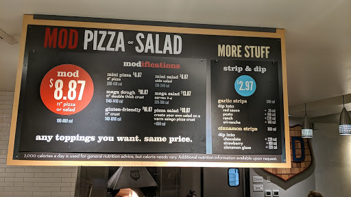 We went there twice on our trip. Great pizza and you get to customize. I had to ask what MOD stood for and it is Made On Demand. Thought it was Modern or Modular but oh well. I gave it a 4 because one snickered when I asked to add marinara sauce to my crust when I picked the wrong order and one other staff who seems to angrily slice the pizza. They also slice into 4 pieces so if you want 6 slices, especially for the kids, then ask for 6 slices. Tasty pizza and MOD should consider adding "Meatballs" as a topping.