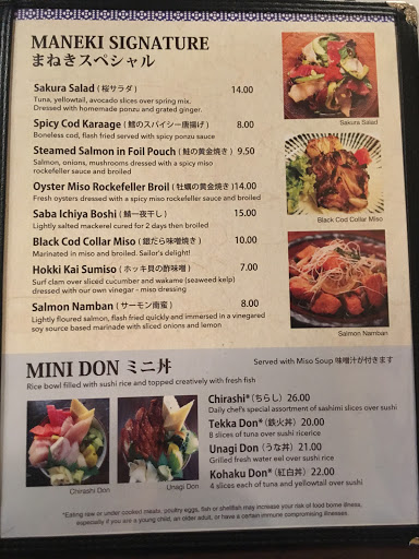 Yummylicious! This is my 3rd time here and also my most favorite visit as it seems we ordered all the right things. We had 4 ppl in our group and ordered: -2 sakana dinners, 1 with salmon teriyaki, 1 with salted mackerel. This is always a good deal b/c it also comes with miso soup, cucumber/shrimp salad, tempura, sashimi and rice. The salmon teriyaki was huge and very tender with good flavor. The mackerel had great flavor but was kinda skimpy on size compared to the salmon. The tempura is so light - just so delightful! -Chirashi Bowl - in my opinion, its kind of a small portion size and Id rather just get another sakana dinner, but the sashimi is really good, fresh and you get a good variety. Comes with miso soup too. The sushi rice is just perfect. -Ika Garlic Bata-Yaki - The flavor was really good, but the squid was slightly overcooked, so a bit rubbery. -Miso cod collar - I loved this one. It was soft and buttery, yum. I highly recommend it and the portion is large for the price! -Sassy Salmon Roll and Yellowtail roll - Simple, not fancy, but very fresh fish and a great price. All this food and it only came to about $80. We were stuffed afterwards. Oh yes, and the service there is wonderful. Everyone is extremely friendly. I cant wait for my next trip back to Maneki. Although this time it wasnt that busy, I still highly recommend making reservations as the last couple of times I was there, it was extremely busy.