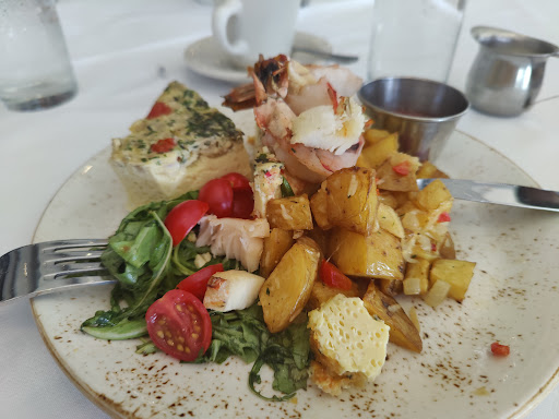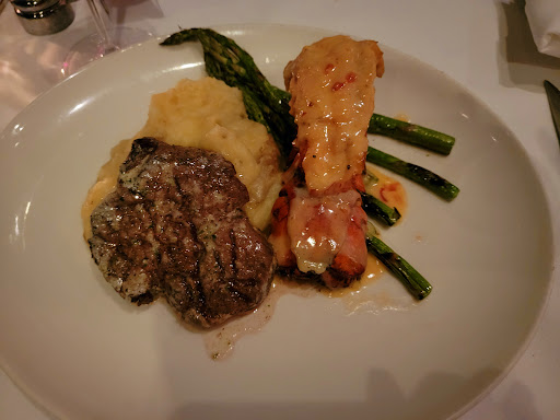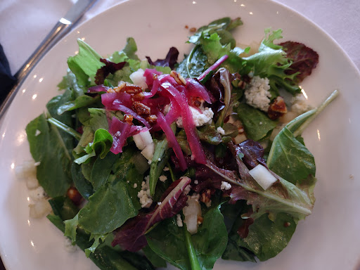 Its at a great location and the service is gracious, but the food itself suffers greatly from the current fads in food fashion. Far too much of the "chef having fun in the kitchen" factor, with a hit on just about every cliche in vogue. (Including the baseball bat size ground pepper mill.) But even so, food fad recipes cant excuse a crab & lobster bisque that has that "cod liver oil" telltale taste of seafood gone past its prime. And of course in crab & lobster soup one does expect to find pieces, however small, of some crabmeat, some lobster, but not a hard, overcooked piece of strongly fishy tasting fish. Some of the people at our table claimed to like the soup but we others were going "eeeuuuw, not so fresh tasting." My guess is that they used the seafood bisque concept as a way to get rid of fish that was no longer fresh. And by the way, this soup was quite buttery, as though the laying in of lots and lots of butter was going to overcome the disgusting not-so-fresh-fish taste.