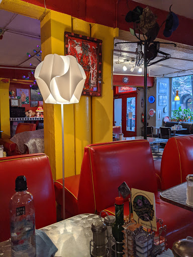Fun atmosphere doesnt make up for inedible food. Was hoping for a nice, greasy-spoon diner breakfast. Instead, got tough and rubbery burnt eggs and toast pre-slathered with margarine. Bon appétit, bin!