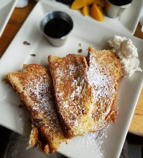 We were crammed into a table for 2 with hardly room to get in out chairs, let alone enough space to enjoy our breakfast. The wait staff were friendly enough but there was no possibility to order a childs meal.... We werent that hungry so we ordered scrambled eggs and bacon- and poppy seed French toast. The scrambled eggs were so so and not worth the high price, the French toast"bar" where you put your own toppings on... Had CANNED FRUIT! Yuck. The coffee was good. The toast (our wait person didnt mention if we had a choice of toast) that came with the scrambled eggs was cold and was a strange grain... Tasted like honey mixed with some weird coarse wheat blend. No condiments on table. Costs extra to split an order. The bill for 2 just average breakfasts was close to $40. Dont go here if you like good food and/ or atmosphere. There are so many other restaurants with good food and good value.