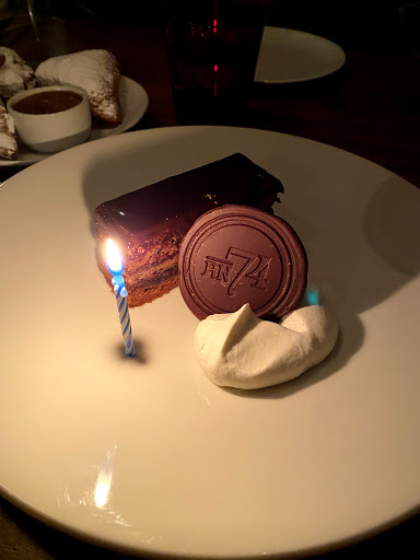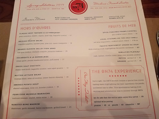 If you are craving fine French dining, RN74 is the place to go! We ordered: A selection of Taylor Shellfish Oysters. Very sweet and fresh, with just a hint of brine. Michael Minas Classic Ahi Tuna Tartare. Well seasoned yet light. Very fresh - not a hint of fishiness. The pine nuts added a pop of texture and flavor. They served it with some white toast which was kind of weirdly bland and boring. The portion size was quite small for the price. Still, this was one of my favorites of the night. Simple concept, excellent execution. Roasted La Belle Foie Gras Doughnut. I was expecting great things of this dish! Sadly I think the sauce (berries and honey?) was too sweet and strong, overpowering the foie gras. In the end it mostly tasted just like a normal doughnut and not as spectacular as I was hoping. Alaskan King Crab Pot Pie. I was also expecting great things of this dish, and it delivered! The presentation was a bit of a show: the server brought a plate with braised carrots and other vegetables (all cooked to perfection), on which he placed a round of puff pastry (flaky and buttery), on which he spooned huge chunks of king crab (oh, the crab, it was sweet and succulent and firm without being chewy in the least...everything you want crab to be...my mouth is watering just thinking about it now), on which he poured a cream sauce (rich and flavorful and tying everything together). Everything on the plate came together really well, all the different textures and flavors complemented each other. I highly recommend this dish. (FYI this dish is listed at MP, which was $68 for us last night - YMMV.) RR Ranch Beef Short Rib Bourguignon. The beef was very tender and flavorful, but nothing about this dish really stood out to me. A tad over salted. Duck Fat Fries. AMAZING. Bursting with flavor and just the perfect crispiness. A satisfying crunch with every bite. Logically I know they must be really fattening but they didnt taste greasy at all! Actually I think these might be among the best fries I have ever tasted. Warning: an addiction may form if you order these fries...they probably sprinkle them with crack or something because I couldnt get enough of them. Crispy Brussels Sprouts and Roasted "Paris" Mushrooms. Lumping these two together because I felt the same about them: tasty, and good side dishes to round out the meal, but nothing really special about them. Overall: the dishes varied in quality, but the better ones were REALLY good and even the not-as-good ones were still solid. The atmosphere was classy yet relaxed. Our server was friendly, helpful, and attentive. We had lots of questions with the menu and he offered great suggestions. Only downside is the dishes arrived very slowly (dinner took quite a bit longer than average - so dont try to schedule anything right after dinner!).