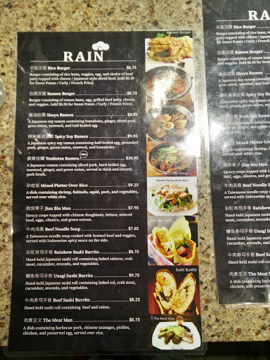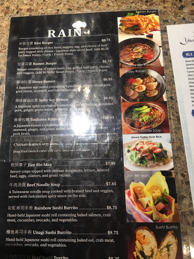 Loud eclectic music and noisy alarms going off as the orders are ready. Most of the time, fresh and delicious food in a stylish environment. Prices are highish, but food is consistently well prepared and tasty. Electric piano on site adds to the fun/hip decore. Order at the counter, then pick up when ready. Our family loves the "sushi burritos," icey milkshakes, tonkatsu and whole-egg ramen with creamy broth. The kitchen prepare a sweet syrup for all the coffee and tea drinks, so you can choose your sweetness. Love that this place serves food until 11pm most nights!