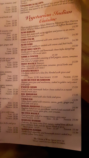 It was my fiance and Is first time at an Indian cuisine. We ordered the vegetable cutlets for an appetizer. They were fried on the outside, which I am not a fan of fried food- but it was quite tasty and comforting. Very filling for two people. I ordered the butter specialty with paneer- Very rich and flavorful, a tad strange to my throat, though- but I think its because Im not used to in-organic foods. It paired very well with the basmati rice they served with it. My love ordered the lamb kabob under the Mediterranean specialties- He thought it was very good. The lamb was tender and cooked with just enough flavor. The service was perfect- my love and I were able to chat without being interrupted constantly. At the end, the owner will give you a sample of desert (not sure if always)...which I find generous and hospitable. Overall, the food reminded me of a comforting Christmas gathering with family. Lovely, lovely atmosphere. A LOT of beer and wine to choose from :)