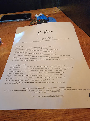 San Fermo gets two stars for ambiance, a good mixologist, and edible food. However, for the same price ($200 for 2 with drinks and wine), you can get loads of truly 5 star alternatives in Ballard / Seattle. The beef carpaccio was the only memorable item we tried on the menu. Despite their attempts to provide a "balanced" composition on the plate, several components simply missed the mark. Proteins were not seasoned or prepared well. Pastas were single note and lacked contrast and flavor. Desserts were disappointing - do not order the cannoli.
