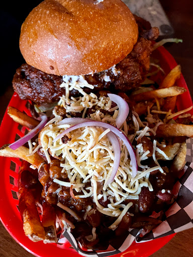 This place has great and very spicy chicken. The chicken sandwich with a "hot" heat level is tasty and will leave you sweating. Also, the fries and fried green tomatoes are really good. Cheep beers and a list of craft cocktails are set in a dive atmosphere and you can play classic video games like Mrs. PacMan. Dont go if youre in a hurry though, chicken is cooked to order so it takes some time.