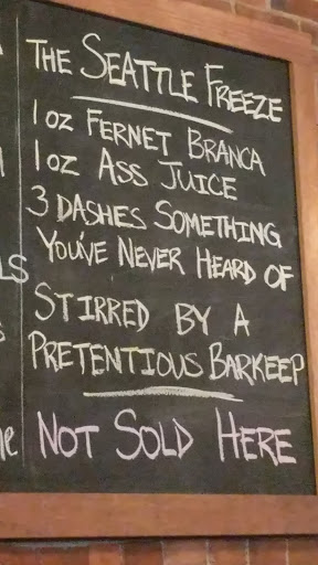 A great name, friendly hosts, great cocktails and imaginative food on an ever changing menu; clever combinations of whats in season or best and freshest on supply. Sadly we dont live in Seattle or thisd be a regular haunt. Please go there; make sure its still there when we go back :-) Highly recommended; great fun.