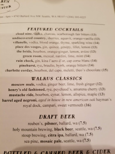 You might be asking, Where is WALRUS and the Carpenter? Inconspicuous address and sign...where is this place?! If you see their sign, go to the right of the sign, open the window door, and walk down the hall. Walrus is located behind the restaurant/bar on the main street. Get there early because I can guarantee a wait no matter what. The best deal is to come during their first 2 hours of opening for their Happy Hour Specials. HALF-OFF Oysters and select wines; $2 off craft cocktails. Their menu is constantly changing to keep things fresh, so theres never a fear of whats in or out of season. Heres my take (June 2013): Butter Lettuce Salad - $10 (3-stars) Fried Oysters - $8 (My friends favorite; 4-stars) Hama Hama Oysters (HH $1.50) (4-stars) Malaspina Oysters (HH$1) (5-stars) Petalos Bierzo $40 Sea Cow Oysters (HH $1.50) Steak Tartare $12 (LOVE, LOVE, LOVE - Full of light flavor and just right!; 5-stars) Treasure Cove Oysters (HH $1.25) (5-stars) Chef Creek Oysters ($2) (4-stars) Maritime Imperial IPA $5 Panna Cotta $8 (love their dessert; 4 stars) Sleeping Beauty $8 Syncline Grenache Bottle $48 (soft red wine; light to medium body) Tomato Gelee $12 (really odd, literally jello like dish, but tomato flavored; 2 stars) Totten Pacific Oysters ($3) (4-stars) Whipped Cod $8 (small jar of whipped fish; 3 1/2 stars) Overall, I am a fan of this place and its a oyster lovers heaven. Its definitely a must stop in Seattle in the Ballard neighborhood, cant wait for my next visit!