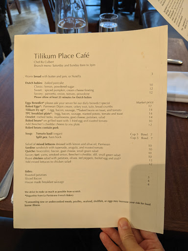 AVOID. Glacially slow service, limited menu that the kitchen does not have the skill to execute. Small portions to boot, I went in on a recent Saturday morning to have brunch; I was very hungry so I asked to start with bread and Nutella as they advertise on their menu. "Sorry, were out of bread, we havent gotten our delivery yet." Really? You have no bread in the whole restaurant? I went on to order their Eggs Benedict special which was advertised as having a "spicy sausage ragu and paprika hollandaise." I dont like the texture of poached eggs, though, so I ordered it with scrambled eggs instead. It came out after about 20 minutes (which is slow unless they were still finishing their prep) with, you guessed it, poached eggs. The server gave me a funny look when I sent it back. Waited another ten minutes. When the dish finally came out properly prepared, I was incredibly disappointed. The "spicy sausage ragu" was a bland, thin sauce with two tiny chunks of sausage in it. The "paprika hollandaise" had no identifiable hint of paprika to it. If youre going to position yourself as (and charge like, the above "meal" plus coffee cost me $18) a good restaurant, you need to make sure you can deliver. Tilikum Place Cafe consistently fails to deliver any time I forget the last time I told myself not to go there anymore.