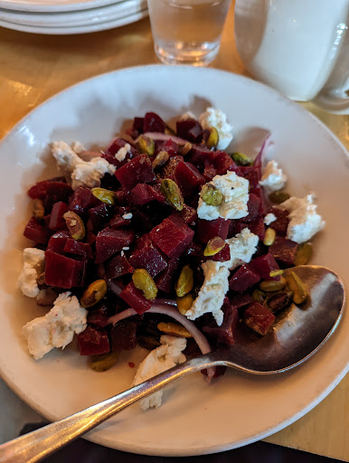 Bluntly, the tile floors, huge windows and masses of kids running around make this place a nightmare for conversation--or sanity. Even when its not filled with families, its still loud. (BTW, I love kids. But not when theyre in restaurants and allowed to run & yell as if theyre at a playground.) Its like the Wallingford playground--but inside. Generally, the food is over-priced and mediocre. (Okay, the beet salad is really good.) I dont like the crust or the sauce and, while Im not a fan of pizza weighed down with "stuff", these toppings are too minimal. (I should add Ive given them three chances. This wasnt written based on an off-night.) So, lets see: loud, expensive, mediocre food. Even though its only four blocks away, Ill always go somewhere else--or stay home.