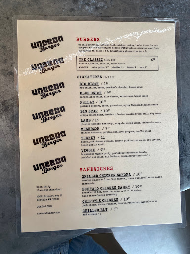 uneeda burger is a great place to get a burger and drink in the Seattle summer! I went here last weekend, and got the standard burger with cheese and a fried egg. The food was delicious, and I regretted not getting fries with it. One thing that uneeda burger does well is having a range of burgers from a non-pretentious $5 standard hamburger up to $10+ specialty burgers like Elk-burgers and burgers with high quality mean. The outside terrace is great in the sun. Its filled with picnic benches, without feeling crowded, and works well for catching up with friends. The location is also great - its a short walk from the Zoo and woodland park, or down the hill to Fremont and the ship canal. The only downside is that in the back of your mind when youre here youll kick yourself a little that you didnt go to Paseos across the street, but one you get your burger that should go away :)