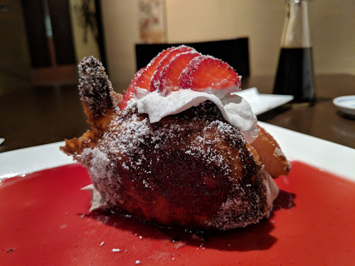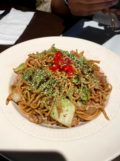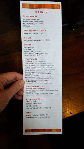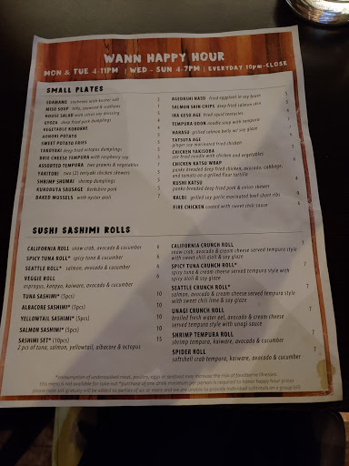 The most important thing to know: Its all-day Happy Hour on Mondays and Tuesdays. And their HH menu is awesome. Its a pretty big menu, and all of the prices are pretty cheap (under $10). I came here on a Tuesday for their HH and ordered a bunch of food because it was so cheap. We go a Spider roll, California roll, shrimp tempura roll, chicken yakisoba, pork short ribs, and pork gyoza. Their rolls are rolled fairly large, which was a tad bit different than what I was used to, but I was okay with that. I wasnt that happy with the spider roll, but the California roll and shrimp tempura rolls were awesome. The chicken yakisoba was just the right savory and sour, and it wasnt greasy at all; something I notice in most yakisoba from cheap teriyaki restaurants. The pork gyoza were large, crispy on the outside and juicy on the inside. They definitely did not have that out-of-the-freezer bag taste you might expect with most gyoza. The pork short ribs were the biggest disappointment, if I had to choose. Theres a fine line between tender and chewy and they were way to chewy for my tastes. We werent planning on getting dessert there, but we thought we would try it out too since it was pretty cheap. We got their chocolate lava cake and green tea tiramisu. The lava cake didnt have any "lava" inside of it, but it was incredible fudgy, moist and delicious and it was served with 2 scoops of vanilla ice cream. The green tea tiramisu probably doesnt sound too appetizing, but it was so soft, fluffy and tasty. I was surprised that I liked it since Im not that big of a fan of green tea to begin with. Overall, Im happy with with the food. The service was a little bit shoddy as the wait-staff werent very attentive and slow to fulfill requests (e.g. more water and utensils). I definitely will be going back to take advantage of their happy hour menu again though.