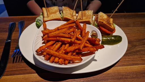 This place is grossly overpriced, and portions are meager. I left hungry. We had the wings as an appetizer, which were delicious. But, they were small and only 8 or 9. Whats up with restaurants getting away with charging gemstone prices fora few hot wings? Is there a chicken shortage I am not aware of? Also, My turkey club looked pitiful. It was very plain, with 1 slice of soggy bacon. one cut square had 1 cm X 1 cm piece of bacon. Come on ! For almost $13, that club should have had huge slices of bacon, and extra meaty with turkey. The taste of the club was average. I will bypass this place next time .