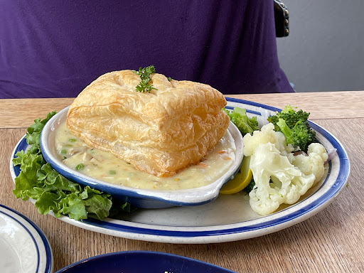 Three of us visited this week and were very dissatisfied. I had eaten here in the past and loved it, so this came as a shock for me. Not only were the tables sticky, staff was lukewarm with customer service of our table and the others around us etc. The staff sat us in the back of the restaurant by the staff service door to the kitchen and multiple times women came out discussing how to train, what she needed to do different and various other things that made us uncomfortable and lose focus on our conversation. Not professionalat all. When we ordered our food it was very disappointing, from flavor, freshness and price. I had the chicken pot pie and the puff pastry had to be a few days old. It was hard as a rock on top of the sauce and make a complete flakes mess all over me and the table as I attempted to eat it. I ordered a Pepsi and there was barely any ice in it, so it wasnt very cold. I ordered my daughter a cheeseburger off the kids menu and it was fries and burger, no drink for $5.95 & if you wanted cheese an additional $1.00!? Really for a kids menu item with no drink? $6.95? I ordered the pot pie as mentioned and it didnt come with a salad for over $15 I had to add one on for $2.50. The salad tasted good, but had way too much dressing. It was a vinaigrette and completely soaked the spinach and was thick.