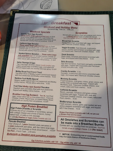 Maltbys Cafe is a must-dine destination. I go there for the amazing farm-style breakfasts: huge portions, wide selection, fresh ingredients. I love the casual, congenial ambiance, and the staff is always, always friendly. Although I maintain a super clean, health conscious diet most of the time, I will make an exception when at Maltbys since I cant pass up their famous cinnamon roll. I appreciate their gluten free bread option as well (when Im being good), but do wish they would consider some other gluten free/dairy free options in their pancake/waffle/french toast offerings. All in all, I absolutely love this place and no one I have ever brought here has ever been disappointed with their food. Highly recommend.