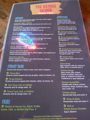 New owners as of April 2013. The kitchen has been cleaned up, new friendly staff, and food that will not fail to satisfy! We have one of the greatest Hamburgers you will ever taste, its truly something special. Come on down and check out the Live music nearly 7 nights a week! A little something for everyone at The Oxford Saloon!