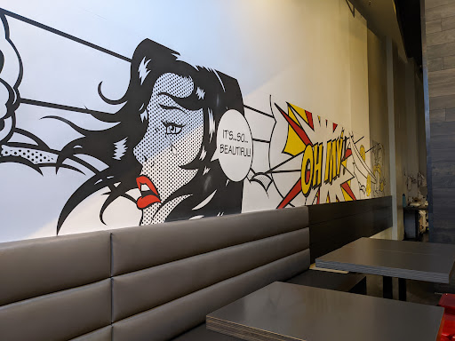 Nice atmosphere. Mostly college aged guests when I visited. I had the ramen burger. It was a nice patty with ramen noodles cooked and then lightly fried into buns. Interesting touch creating a more fork friendly than hand friendly burger. The corn starch used to hold the noodles together made them a little dry in the mouth. Served with edemame.