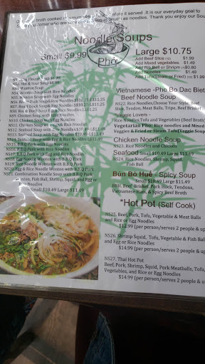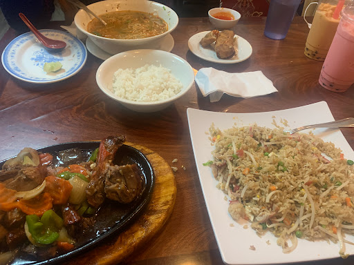 Dont let the hot bar of food scare you away. Thats for to-go orders and I hear its pretty good. They also have stuff from the kitchen. The Mongolian beef comes served on a sizzling iron plate with a very good cut of meat, family style. The Pho is excellent (a "small" is more than enough for one person) Appears they have Korean BBQ too. And Bubble Tea (tapioca drinks) Great prices for everything except the Bubble tea (good stuff, but the prices are a bit high, Im California-spoiled from living there for a few years) The Vietnamese coffee is excellent too. Try that with tapioca in it if youre feeling adventurous, thats one of my favorite treats.