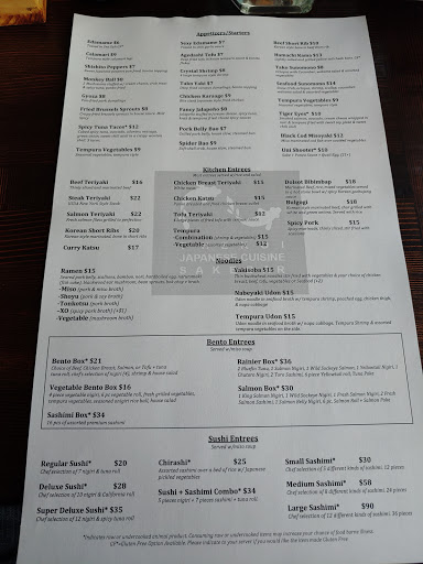 If you want authentic Japanese Food ... this is NOT the place to be. That said, many items on the menu are pretty good, but then there are a few dishes that leaves you thinking "What the **** was that! The sushi here is decent, but definately not the best in Tacoma. There is a fairly good select of alcohol drinks. The atmosphere here is nothing really special ... if anything it can get pretty noisy. The price is steep for what you get here ... our party of four came to $134 (4 entrees plus three sodas and a glass of water). The service was mixed, at times lots of attention and then she disappeared for 20 - 25 minutes, then lots of attention and then we waited almost 15 minutes (more than two entire innings of the baseball game on TV) to get the bill ... total time there was about a hour & 45 minutes.