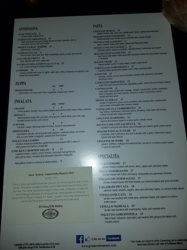 My wife and I go out often in Seattle, The Eastside and the Southend. There are plenty of dining options in the southend, but most are chain restaurants and not very intimate. Grazies, on the other hand, feels very local and intimate. Although the restaurant is small, theyve done a good job separating the spaces to make each table as private as it can be. Weve dined at Grazies at least a dozen times and have always had good service, great food and an overall good value. If youre looking for a romantic restaurant with great Italian food in the Tukwila/Renton/Kent area, this is great choice.