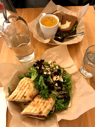 First of all, the staff, while professional, seemed pretty stuck up. They barely listened to my order, and there was some confusion with my order (they had to come back due to their inattentiveness to ask what I wanted again, and even gave me misinformation after taking my order) because the waitress wasnt paying attention when I ordered the "express" special. The food is kind of pricey for the product you get: $25 before tip during lunch got me soup, salad, sandwich, and a latte. The soup de jour was delicious but a bit odd with the texture and had a couple bits of bone from the chicken. Salad was very straight-forward, greens, dried fruit, chopped nuts and light but tasty vinaigrette. Sandwich had a very delicious spread but the meat itself was fairly bland. The latte was standard but done properly. Ill go back to try different items and buy bread because they are close... But Im not sure if Id go for anything other than the specials due to the menu prices. For a lunch cafe to be charging what they do, their really game needs to be taken up a notch.