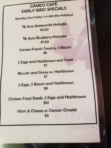 Its not the nicest restaurant. Its not the best restaurant. But its exactly what it tries to and needs to be. Early morning chicken fried steak with lovely old-school diner feel? Yup. Waitresses who are always there to fill up your coffee and call you "hon"? Mmhmm. Plenty of old timers who make you feel a decade younger than you really are? Oh yeah. Cameo wants to take you back to a simpler time and, by and large, it succeeds.