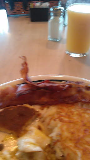 No one at the counter to greet me. Took 90 seconds for me to be acknowledged. I like a cool environment, but the dining room was downright frigid. I was seated facing a vacated table that had not yet been cleared. Twenty minutes passed before the table was cleaned off. Granted, the restaurant wasnt busy and the table wasnt needed to seat other diners, but I didnt want to look at it. Overall, the food was good (though the bacon was slightly overcooked), and the service was prompt and courteous once I was seated. I visit this restaurant every few months while my vehicle is in the shop being serviced, and todays experience was generally on par with most of my previous visits. Yes, Ill be back because the restaurant is within convenient walking distance from my auto shop. $15 for breakfast, coffee and a tip is pretty steep, though, for the quality of the environment, food and service. (No sales tax in Oregon, so that wasnt a factor in the $15 tab.) BONUS COMMENT: The music was too loud.